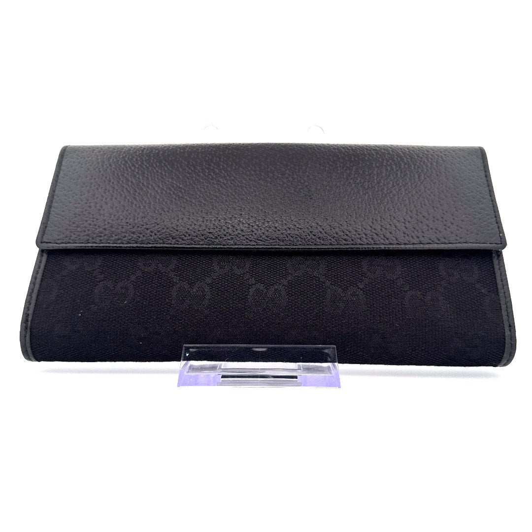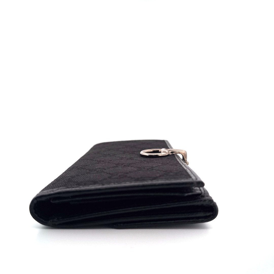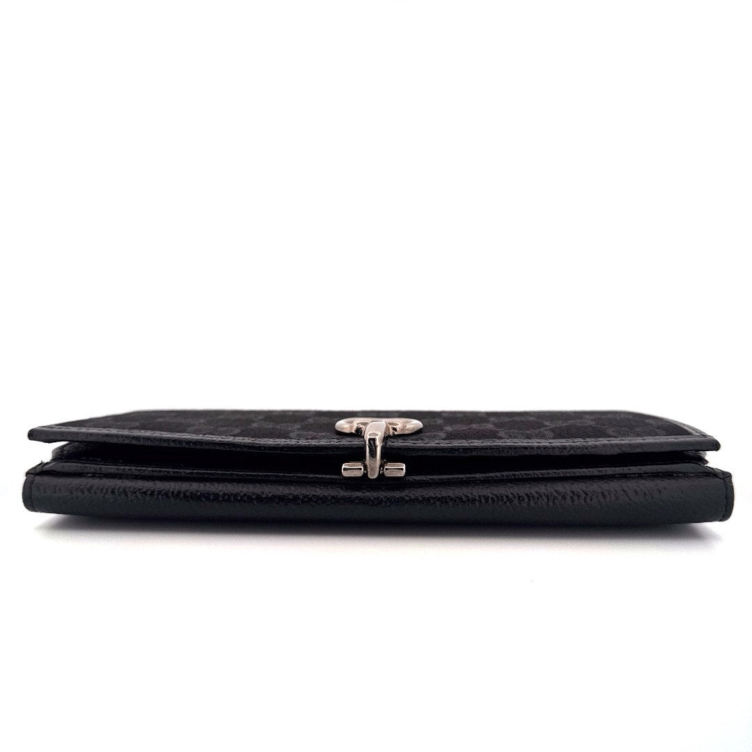 This timeless Gucci continental wallet is crafted from durable black GG canvas with tonal leather trim, accented by a sleek silver-tone ring clasp. The understated design and monochrome GG motif make it a versatile accessory that pairs effortlessly with any look.