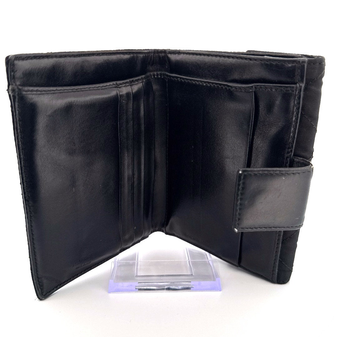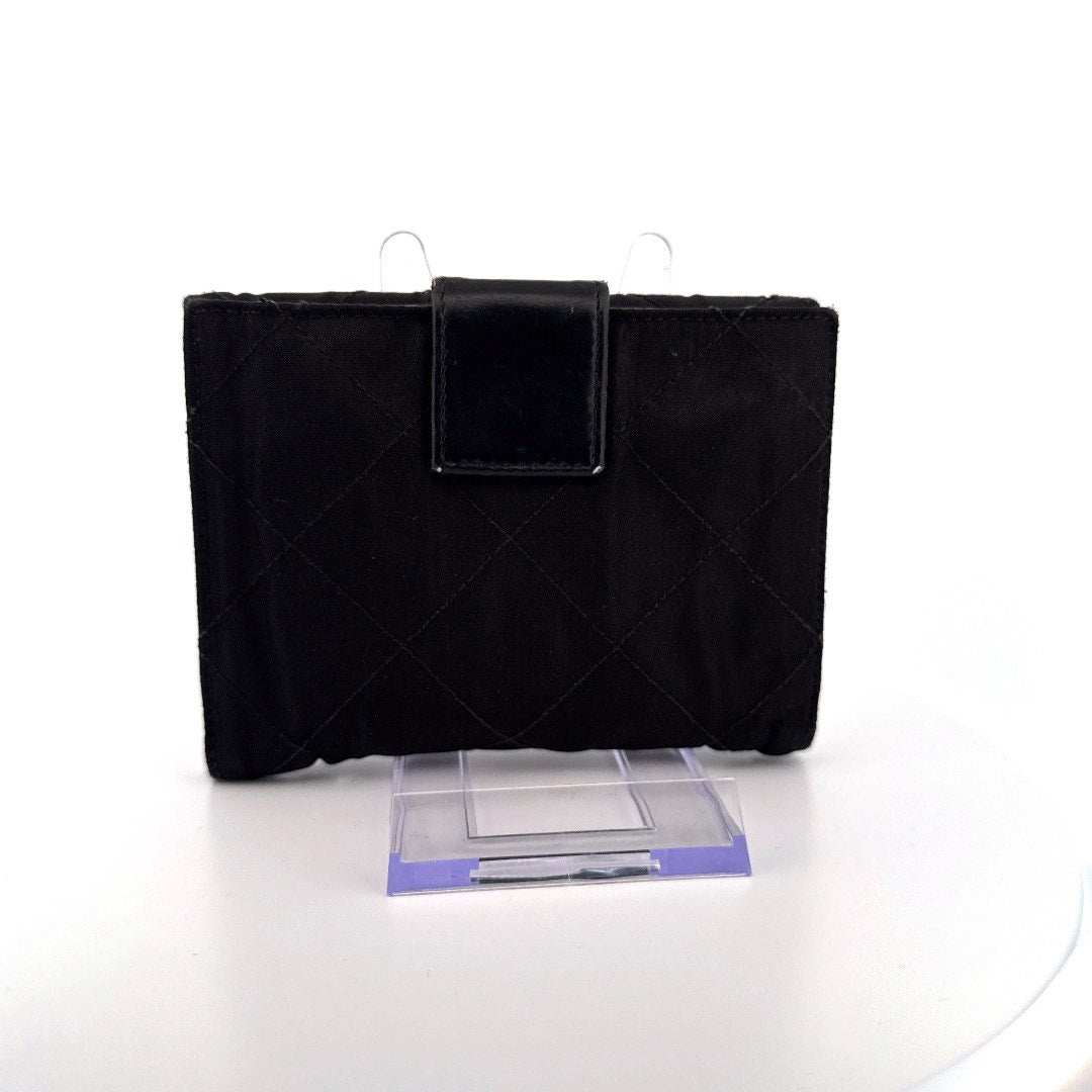 Classic Prada wallet crafted in black quilted Tessuto nylon with the iconic silver-tone Prada triangle logo plaque. Features a flap snap closure, smooth leather interior with multiple card slots, bill compartments, and coin pocket. Lightweight yet durable, this piece blends timeless sophistication with functional everyday design. Comes with certificate of authenticity.