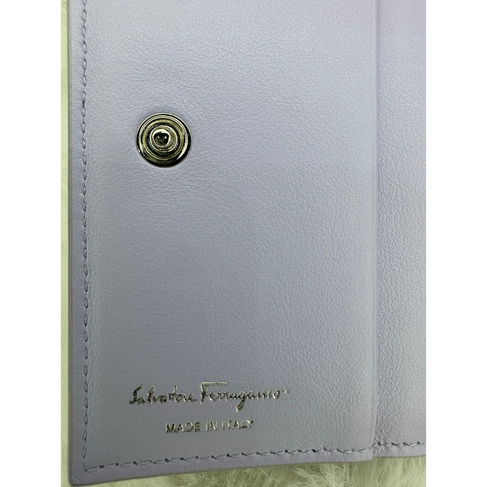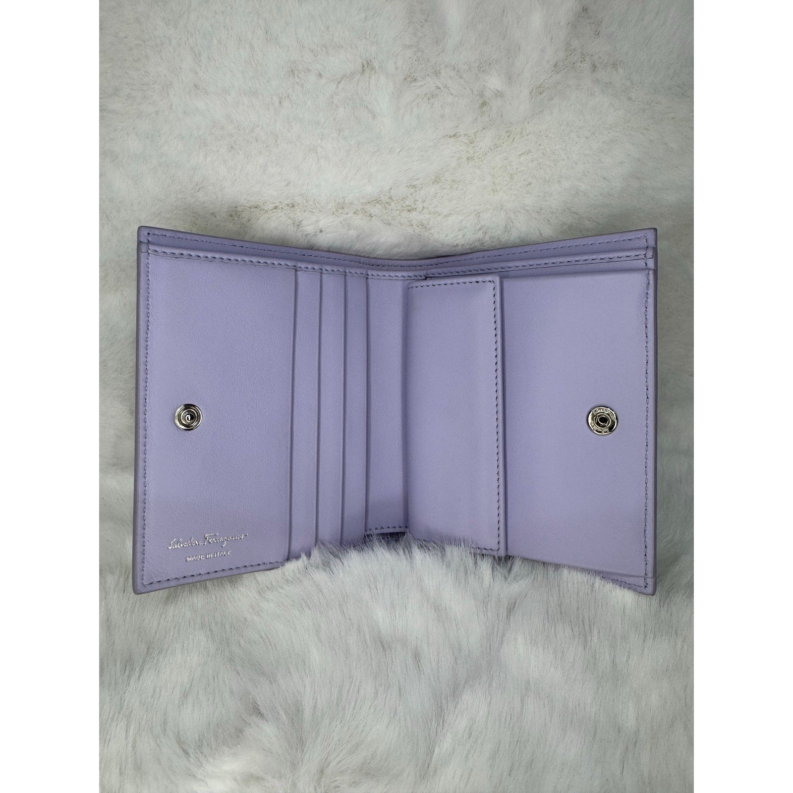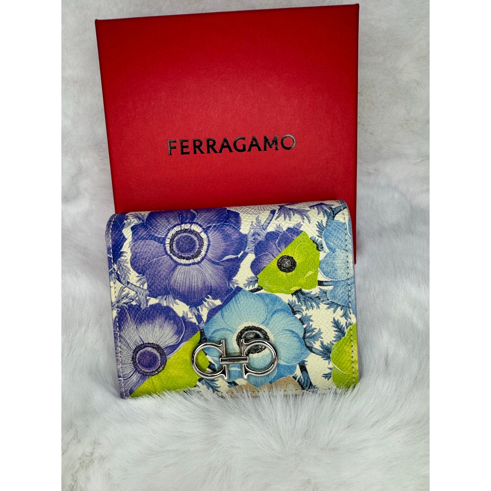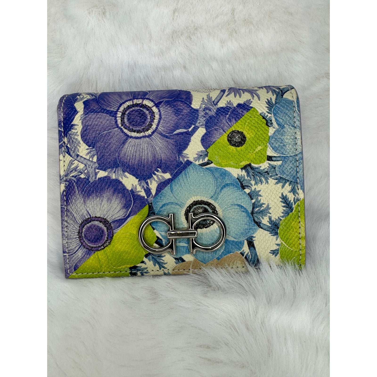 This Salvatore Ferragamo wallet is crafted in grained leather with a vibrant floral print in shades of blue, purple, green, and cream. The front is accented with the iconic silver-tone Gancini clasp, a hallmark of the Ferragamo house. The interior is finished in smooth lavender leather and designed for everyday practicality, offering multiple compartments for cards, cash, and essentials. A perfect blend of Italian craftsmanship and playful elegance, this piece makes a standout accessory for any collection.