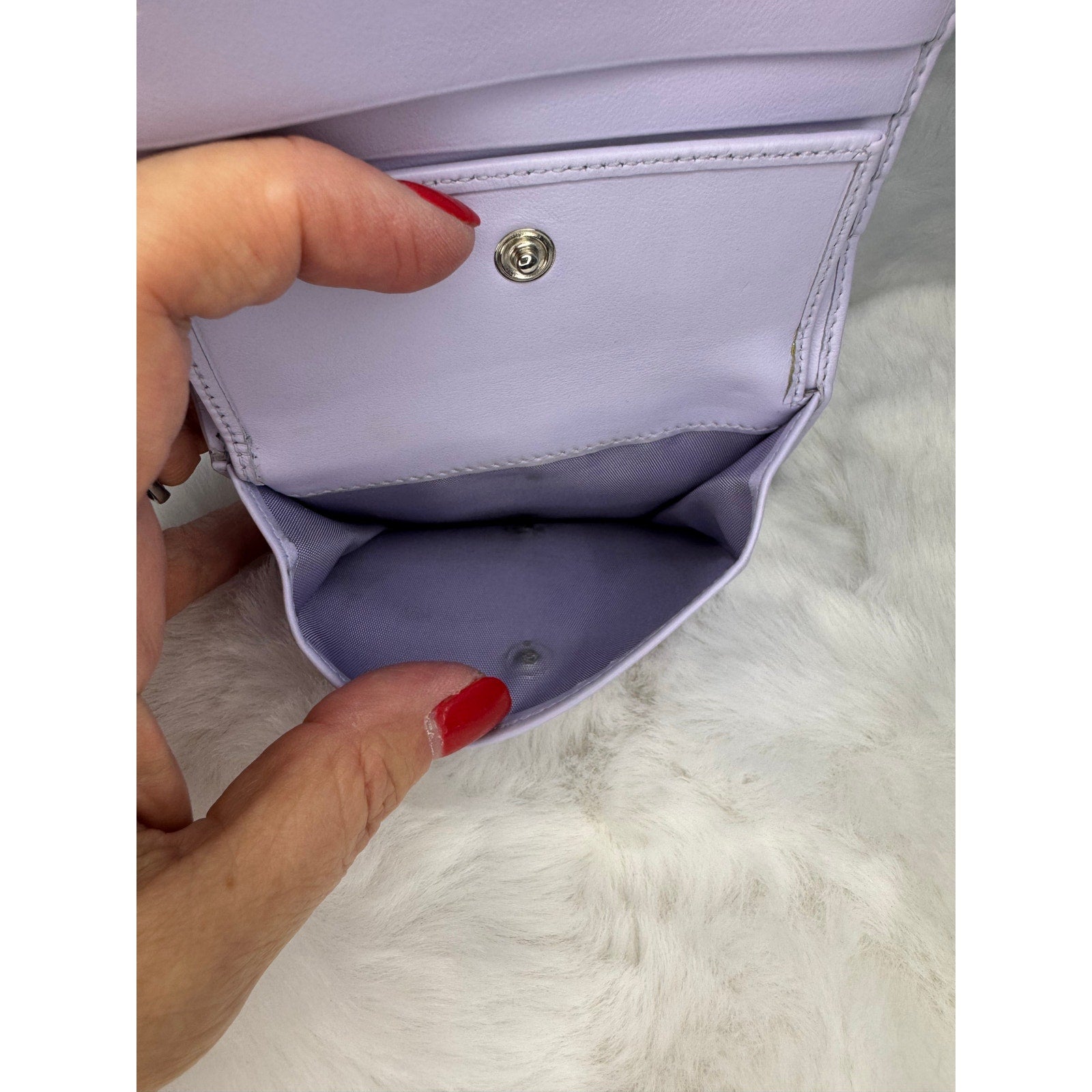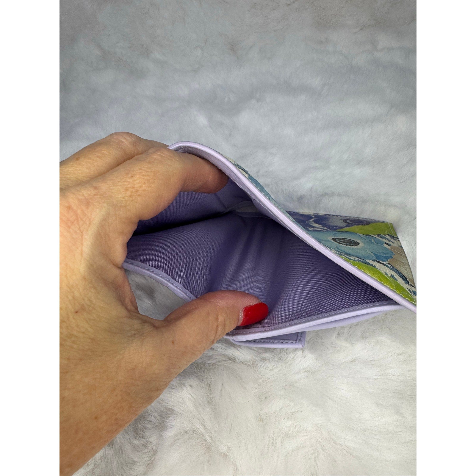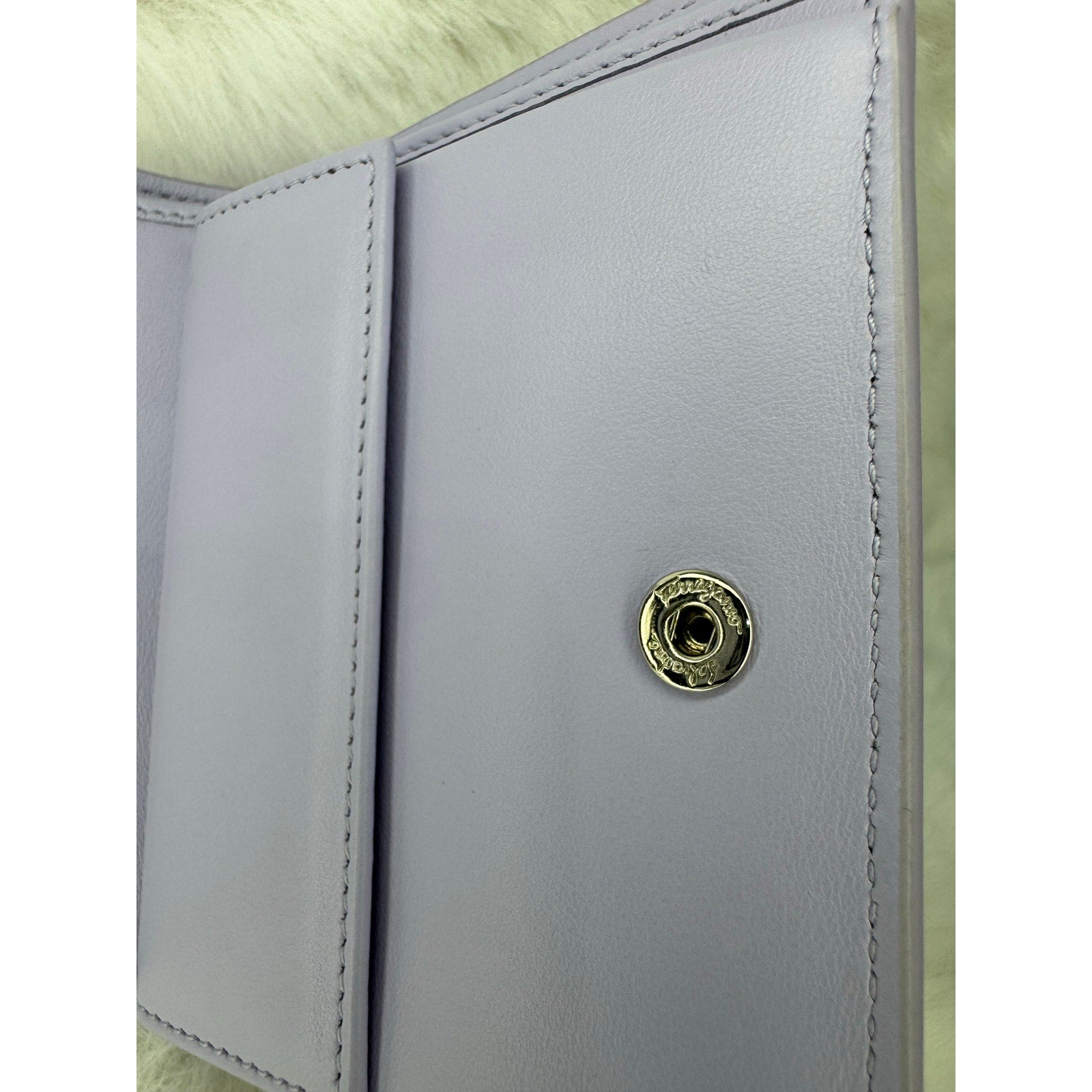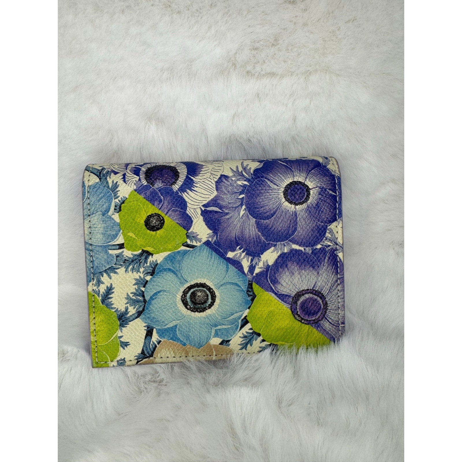 This Salvatore Ferragamo wallet is crafted in grained leather with a vibrant floral print in shades of blue, purple, green, and cream. The front is accented with the iconic silver-tone Gancini clasp, a hallmark of the Ferragamo house. The interior is finished in smooth lavender leather and designed for everyday practicality, offering multiple compartments for cards, cash, and essentials. A perfect blend of Italian craftsmanship and playful elegance, this piece makes a standout accessory for any collection.