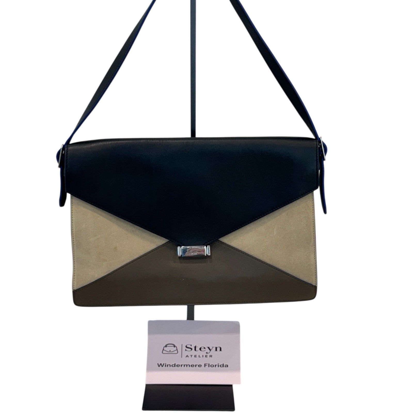 Architectural elegance meets everyday edge with this Céline Trapeze Envelope Bag. Featuring smooth black leather, beige suede side panels, and olive contrast leather, this piece stuns with its sharp lines and refined detailing. The envelope-style flap and wide shoulder strap complete the modernist look.